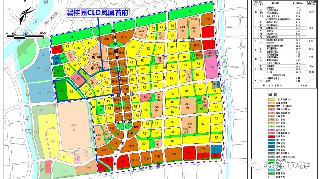 图中蓝色框内是CLD凤凰首府已经确定的开发区域,它的大致位置是工业北路以北、规划奥体中路延长线的西侧。或者说,它在工业北路幸福柳广场公交站以北1公里之外、山师大附中的东北侧。