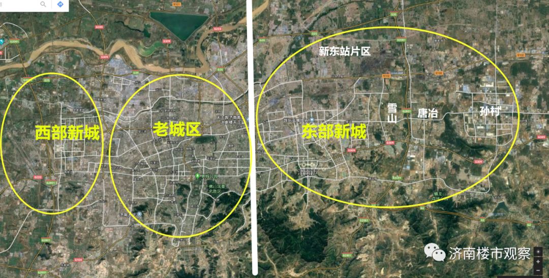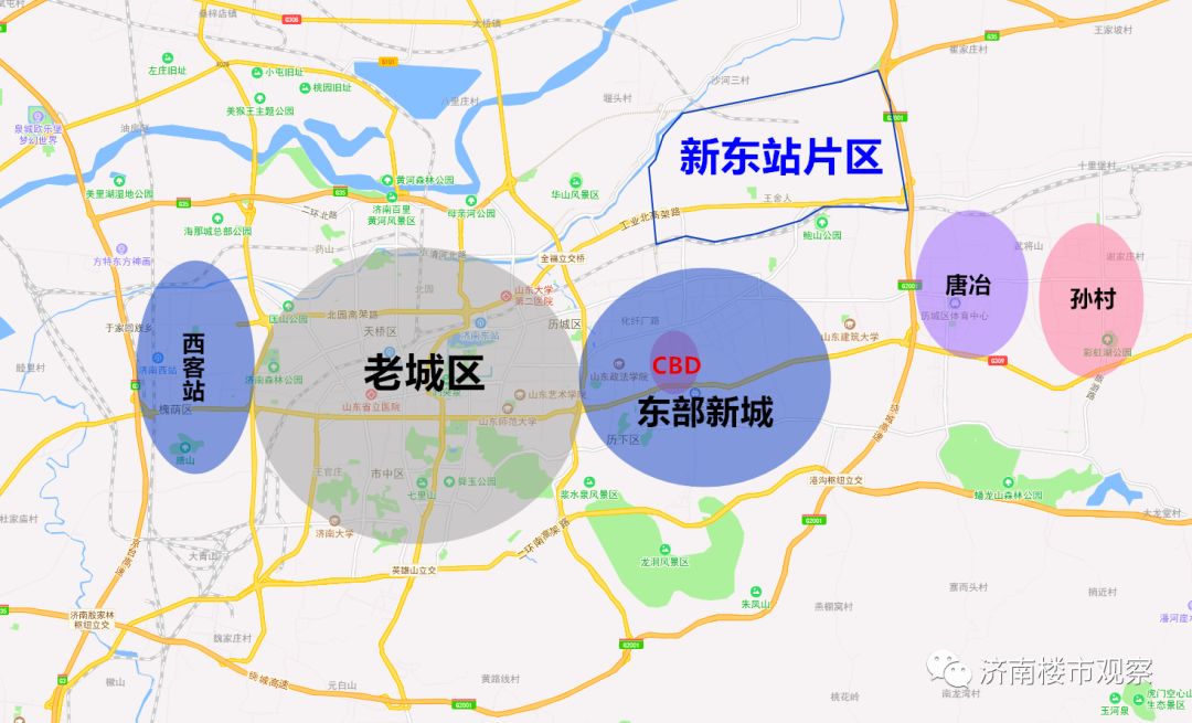 这张图并不是画饼充饥。我们可以看到,东部新城那个大圆圈内,除了建成区,还有雪山片区、唐冶、孙村、新东站,这些都是济南近些年的开发热点。