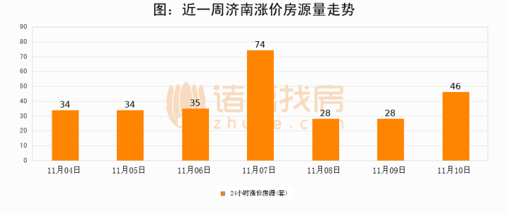 根据诸葛找房数据显示,济南24小时涨价房源量为46套,较11月09日增加18套,环比上涨64.3%。与此同时,涨价房源占比小幅扩大,业主信心有所提升。
