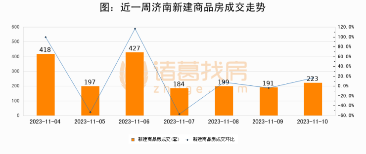 根据济南市住房和城乡建设局数据显示,2023年11月10日济南新建商品房成交223套,较昨日增加32套,环比上涨16.8%