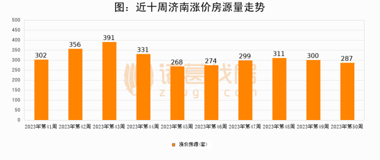从调价房源来看,第50周济南涨价房源287套,较上周下降4.3%。与此同时,50周涨价房源占比回落1.18个百分点,业主信心小幅波动,购房者可则需入市。
