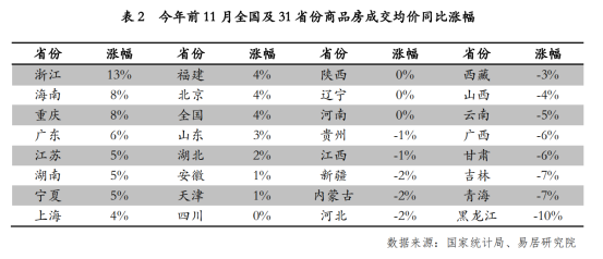 从商品房成交价格指标来看,数据显示,今年前 11 月,全国有10个省份商品房成交均价同比涨幅超过全国平均水平,有21个省份则弱于全国平均水平。另外,有13个省份出现了房价下跌现象,其中,黑龙江房价跌幅较大,为10%。而吉林房价跌幅7%,与青海并列第二。