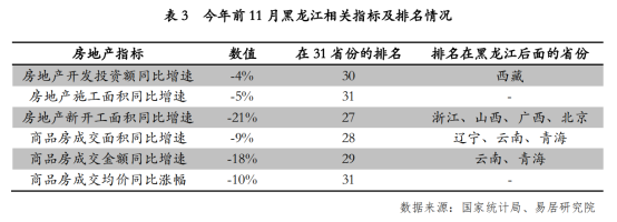 此外,今年前 11 月,黑龙江其他房地产相关指标普遍面临较大的下行压力,在31省份中排名也比较靠后。