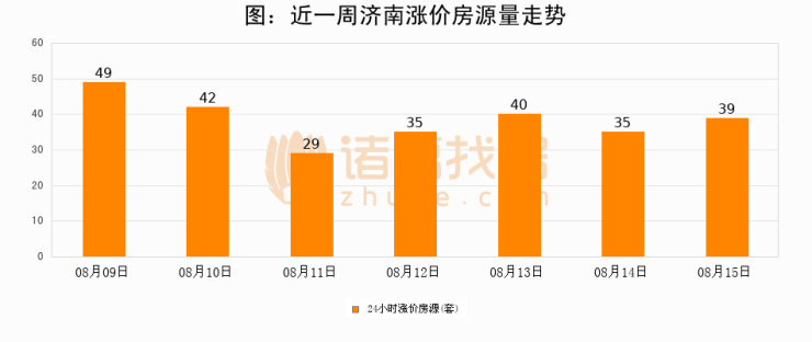 根据诸葛找房数据显示,济南24小时涨价房源量为39套,较08月14日增加4套,环比上涨11.4%。与此同时,涨价房源占比小幅扩大,业主信心有所提升。