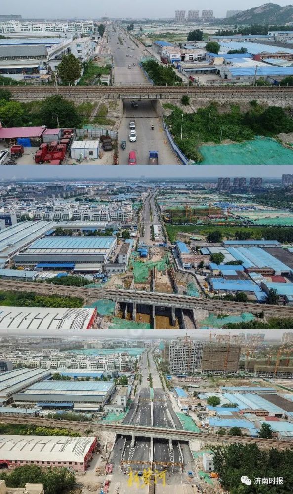 从上到下依次为:2018年8月30日,铁路涵洞改造前;2020年7月21日,铁路框架桥主体建成;2021年5月7日,道路全部建成。(济南时报)