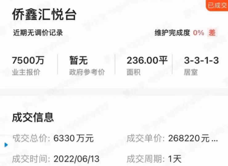 6月14日,一份汇悦台的成交截图在市场上引起关注。截图显示,该房源面积为236平方米,挂牌价为7500万元,最终以6330万元成交,折合单价为26.8万元/平方米,成交周期仅一天。