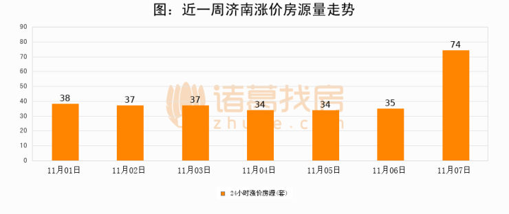 根据诸葛找房数据显示,济南24小时涨价房源量为74套,较11月06日增加39套,环比上涨111.4%。与此同时,涨价房源占比小幅扩大,业主信心有所提升。