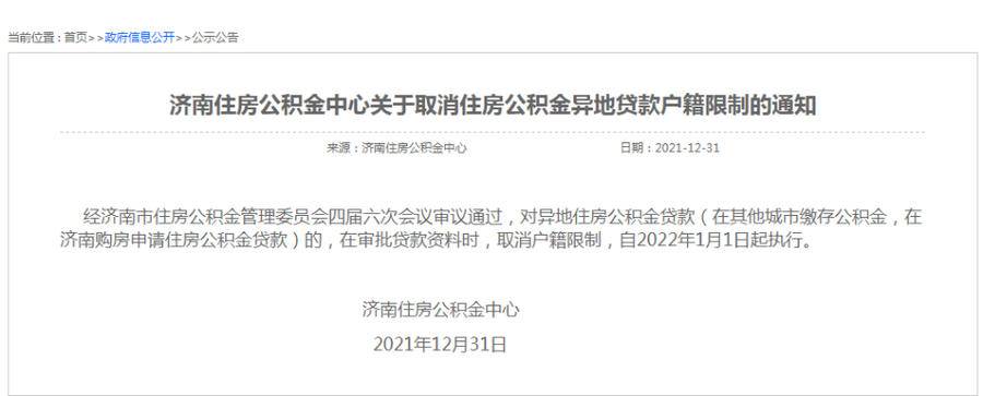 2021年最后一天,济南住房公积金中心公布《关于取消住房公积金异地贷款户籍限制的通知》。根据《通知》,自2022年1月1日起,济南市对异地住房公积金贷款(在其他城市缴存公积金,在济南购房申请住房公积金贷款)的,在审批贷款资料时,取消户籍限制。