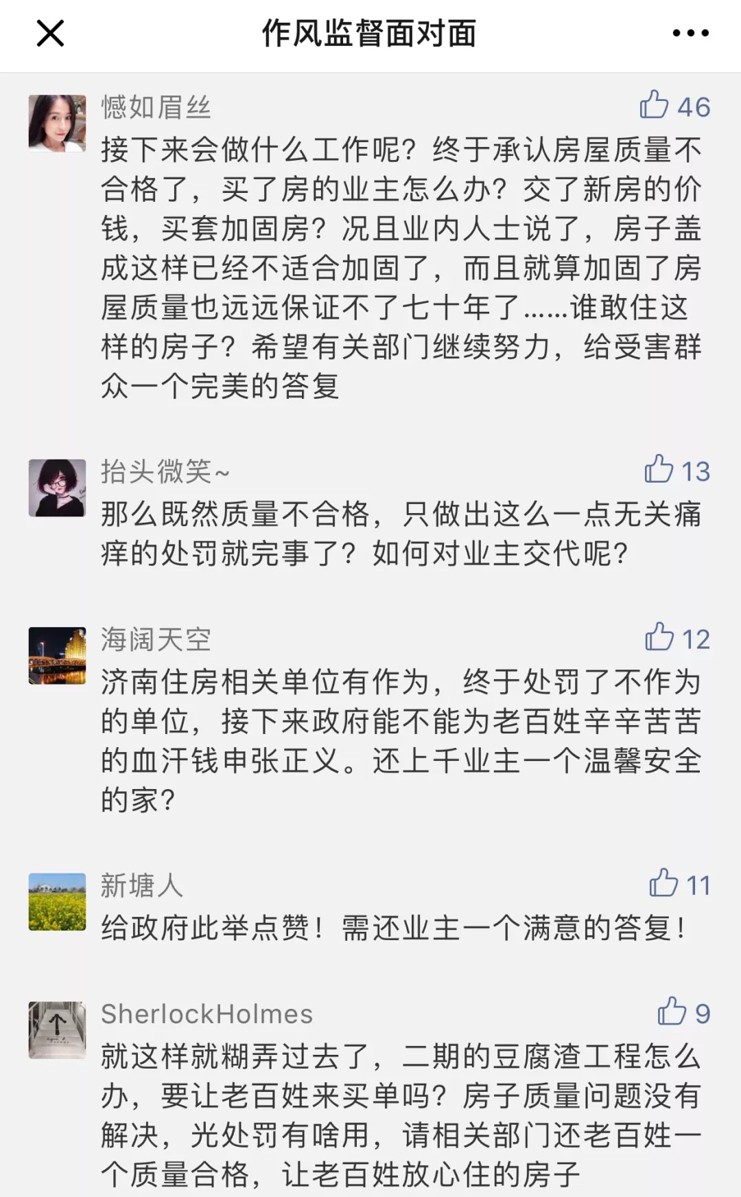 4月4日,济南市住房和城乡建设局发出《关于对济南融汇城玫瑰公馆二期质量问题相关责任单位及责任人处理意见的通报》——