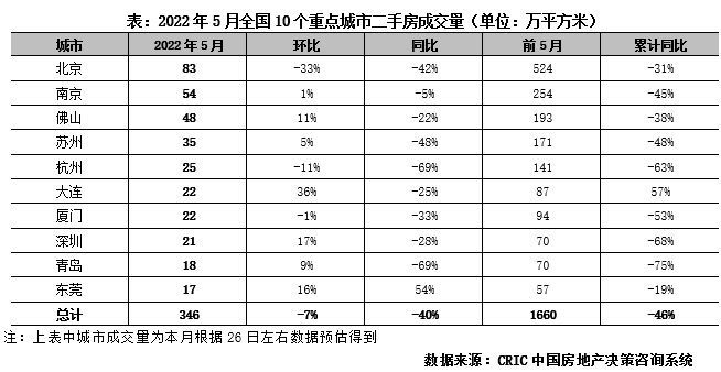 5月10个重点城市预计成交346万平方米,环比下降7%,同比下降40%。前5个月,10个城市同比下跌46%。