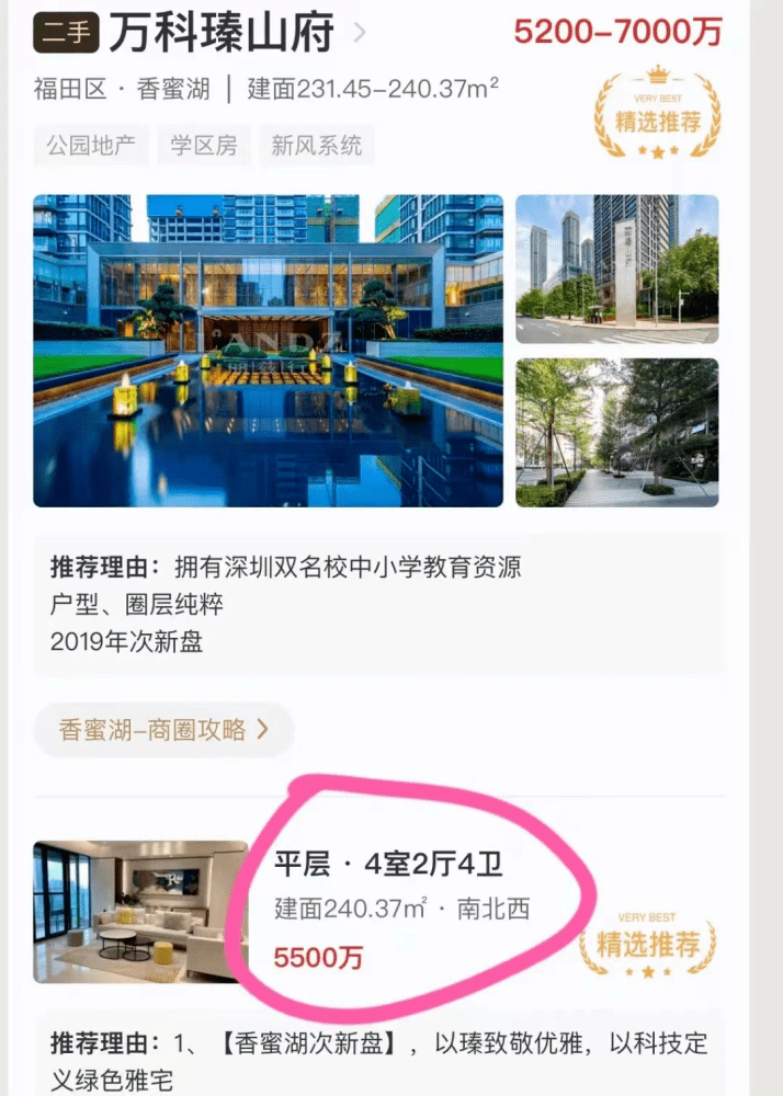 排名前列,这两个新盘价格相比周边的二手房明显倒挂。海德园新房限价, 它周边二手住宅的挂牌价普遍在18万/平方米以上,安栾公馆实际挂牌价在19.9万/平方米,天健公馆和万科臻山府二手房源的实际报价也多在20万/平方米以上。算一笔账,海德园161的四房,总价在2028万左右,如果按周边二手房18万的均价卖出,能赚869万,面积越大,价差也会越大, 招商仕林臻邸均价11.5万,远低于周边的二手房,这对投资者来说,是明确的并且是很可观的收益。