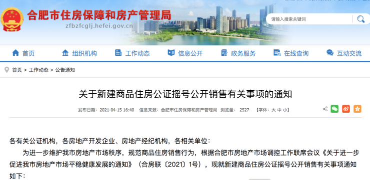 4月15日,合肥市住房保障和房产管理局联合市司法局发布《关于新建商品住房公证摇号公开销售有关事项的通知》(以下简称《通知》),对新建商品住房公证摇号公开销售具体情况进行了规定。