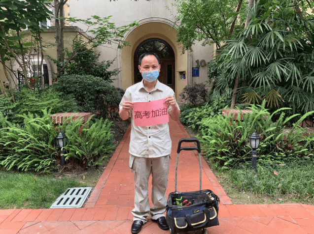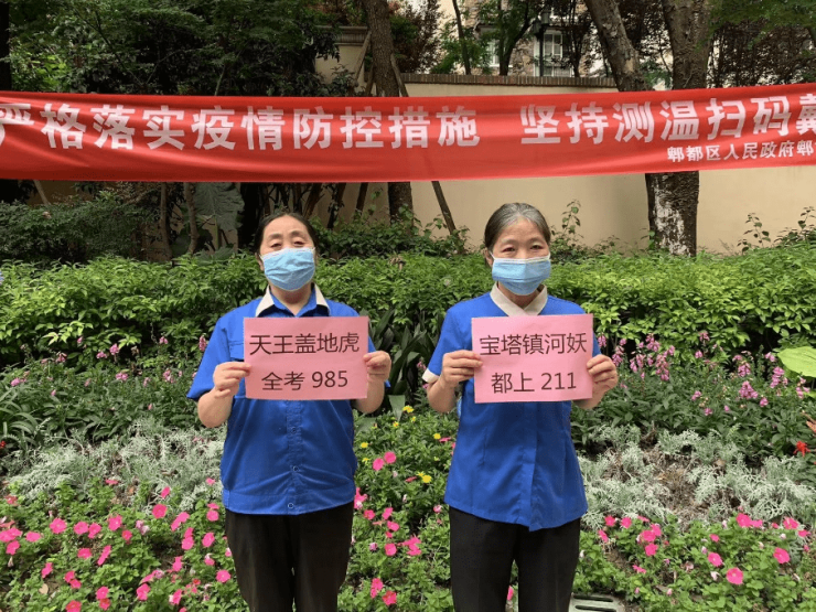 小管家手里举着的是最朴实的“高考加油”“高考顺利”;保安队长的勉励是“关关难过关关过”,还亲自开启背后的“幸运之门”;而“天王盖地虎,全考985”“宝塔镇河妖,都上211”这么接地气的标语,被保洁阿姨微笑着握在手上,瞬间显得可爱起来。