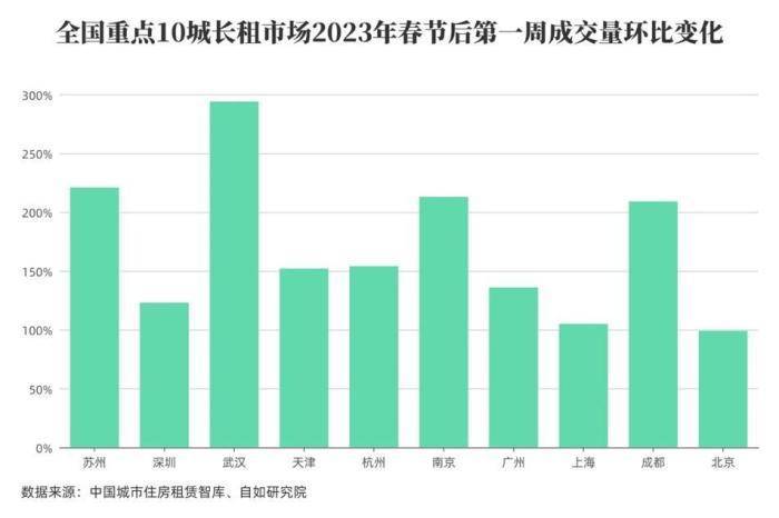 中国城市住房租赁智库联合自如研究院(下称:智库和研究院)当日发布的数据显示,自1月底开始,北京、上海、广州、深圳、杭州、南京、成都、天津、武汉、苏州10个城市长租市场租客成交量快速回升。相较春节前,春节后一周,租客成交量环比增长140%。智库和研究院方面表示,对比2019年同期数据,今年春节后上述10城租客成交量增长11%。