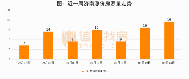 根据诸葛找房数据显示,济南24小时涨价房源量为19套,较09月12日增加3套,环比上涨18.8%。与此同时,涨价房源占比小幅扩大,业主信心有所提升。