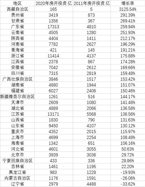 排名前列财经记者根据国家统计局数据,对2020年31个省份的房地产开发投资数据和2011年以来的房地产开发投资增速统计梳理发现,房地产开发投资前十的省份分别是广东、江苏、浙江、山东、河南、四川、安徽、福建、湖北和湖南,可以看到主要是经济大省和人口大省。而从近年来的变化看,西藏、贵州、甘肃、广东、云南、陕西、河南、青海、浙江、江西位居前十,房地产开发投资增速主要与人口流动、城镇化率速度和经济发展速度相关。