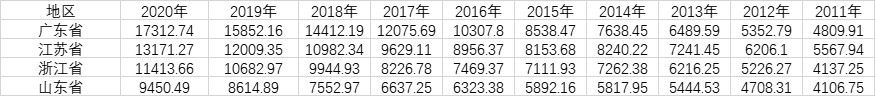 表:东部沿海四个经济大省2011年-2020年历年房地产开发投资额(单位:亿元。数据来源:国家统计局)