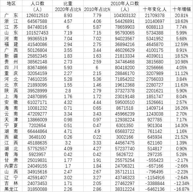 表:31个省份十年来人口变化(数据来源:国家统计局)