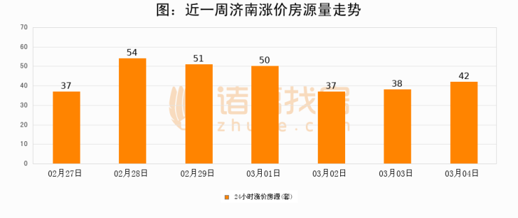 根据诸葛找房数据显示,济南24小时涨价房源量为42套,较03月03日增加4套,环比上涨10.5%。与此同时,涨价房源占比小幅扩大,业主信心有所提升。