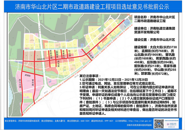 太白大街、曾巩路、孟頫街,一连串以古代名人命名的道路亮相华山北片区。12月22日,济南市自然资源和规划局对华山北片区二期市政道路建设工程项目选址意见书批前公示,共有10条道路亮相,其中历山北路越过二环北路北延华山北片区,长约1900米。