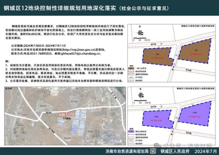 钢城区12地块控制性详细规划用地深化落实,调整为物流仓储用地,征求市民意见,公示期为7月5日至11日,地点在济南市自然资源和规划局网站及现场,电话、邮箱、联系方式详述。