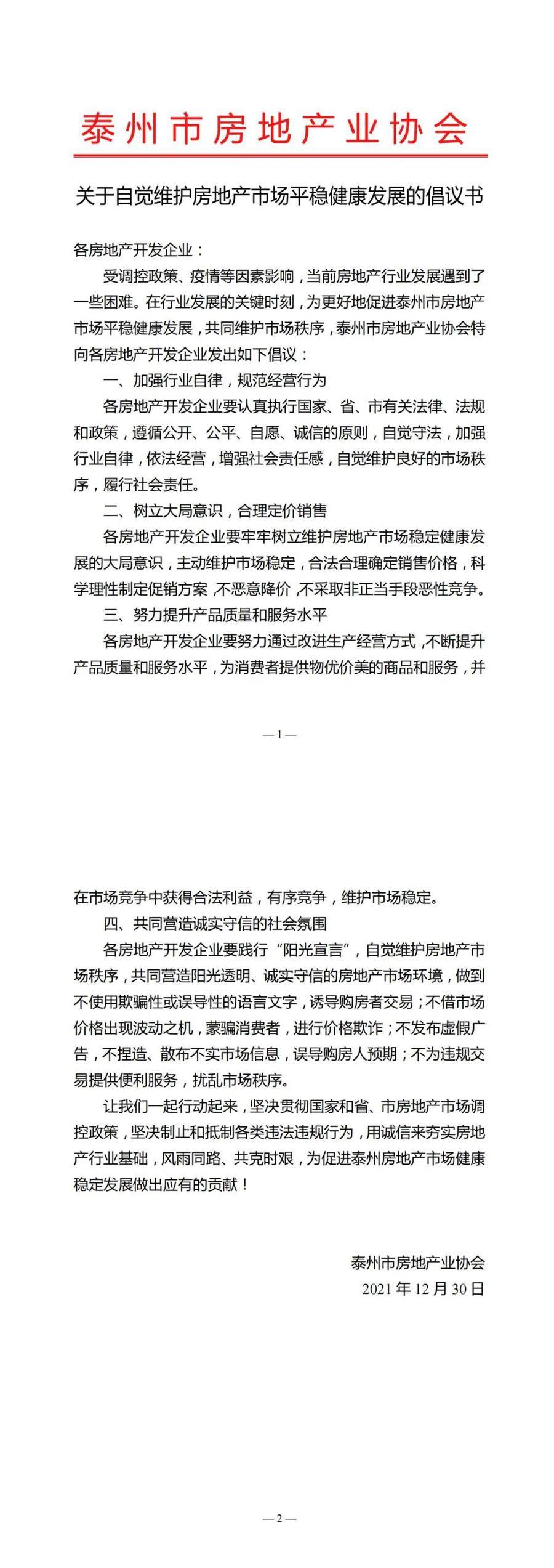 1月6日,记者从泰州市房地产业协会官微获悉,近日该协会向房企发布《关于自觉维护房地产市场平稳健康发展的倡议书》。
