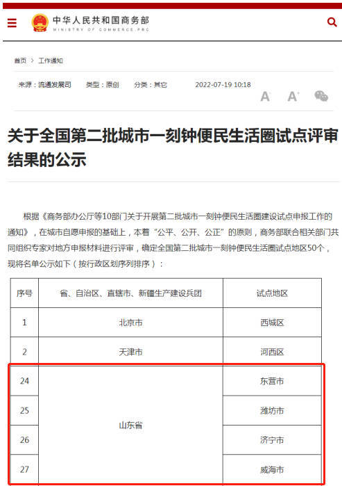近期,商务部公示全国第二批城市一刻钟便民生活圈试点评审结果。记者获悉,山东省推荐的东营、潍坊、济宁、威海市4个城市全部入围,成为全国第二批城市一刻钟便民生活圈试点。