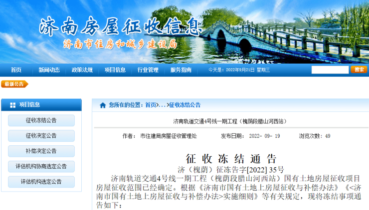9月19日,槐荫区住房和城乡建设局发布征收冻结通告,济南轨道交通4号线一期工程(槐荫段腊山河西站)国有土地房屋征收项目房屋征收范围已经确定。