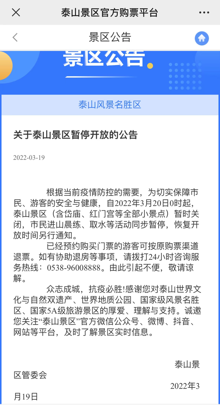 根据当前疫情防控的需要,为切实保障市民、游客的安全与健康,自2022年3月20日0时起,泰山景区(含岱庙、红门宫等全部小景点)暂时关闭,市民进山晨练、取水等活动同步暂停,恢复开放时间另行通知。