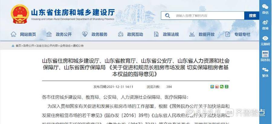 12月31日,山东省住房和城乡建设厅、山东省教育厅、山东省公安厅、山东省人力资源和社会保障厅、山东省医疗保障局五部门联合发布《关于促进和规范长租房市场发展 切实保障租房者基本权益的指导意见》,促进和发展长租房市场,使租购住房在享受公共服务上具有同等权利。