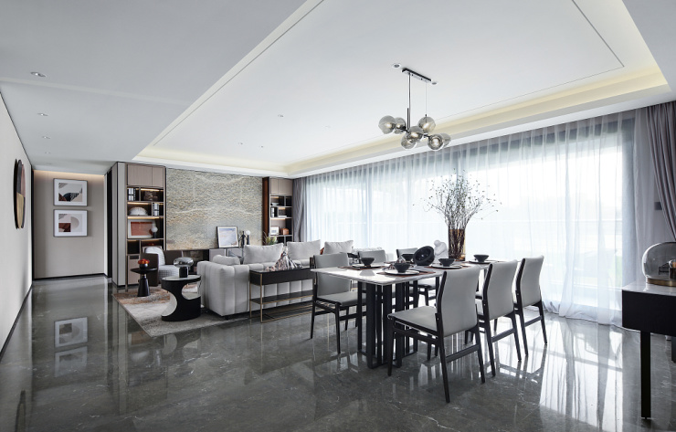 客厅超大的面宽,与餐厅紧密相连,增加了空间的使用率。超大双厅空间设计的优势在于各功能分区明晰而空间相融,即便摆上茶几沙发仍有富余,行动十分方便。视觉上大幅提升客厅开阔感,为一家人的融情生活创造加倍可能。