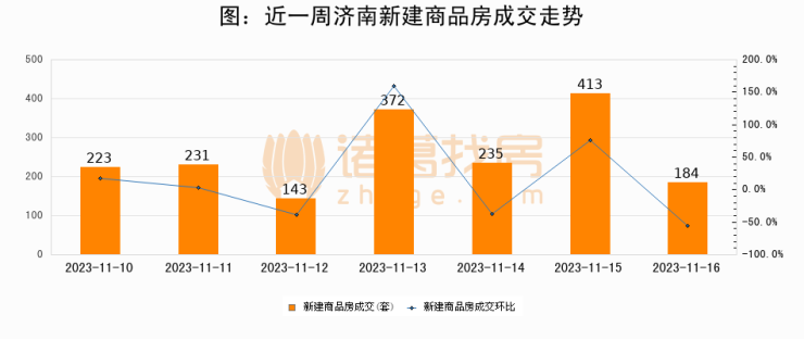 根据济南市住房和城乡建设局数据显示,2023年11月16日济南新建商品房成交184套,较昨日减少229套,环比下降55.5%