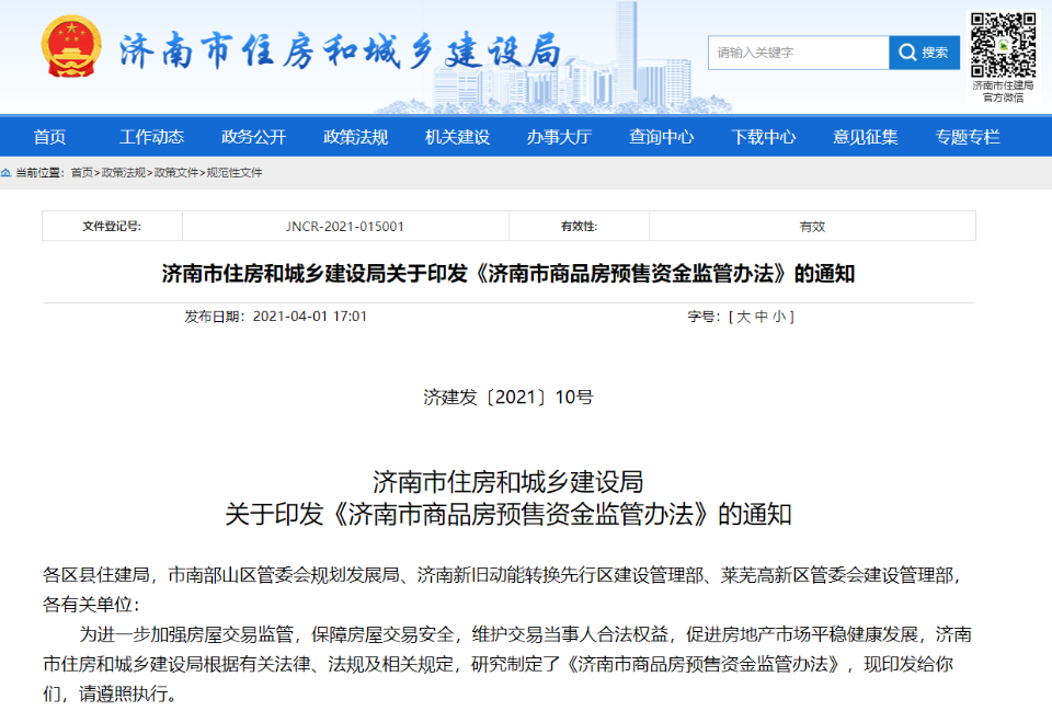 济南新规!4月6日起,定金首付房贷等商品房预售资金存监管账户