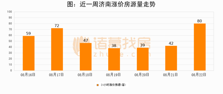 根据诸葛找房数据显示,济南24小时涨价房源量为80套,较08月21日增加38套,环比上涨90.5%。与此同时,涨价房源占比小幅扩大,业主信心有所提升。