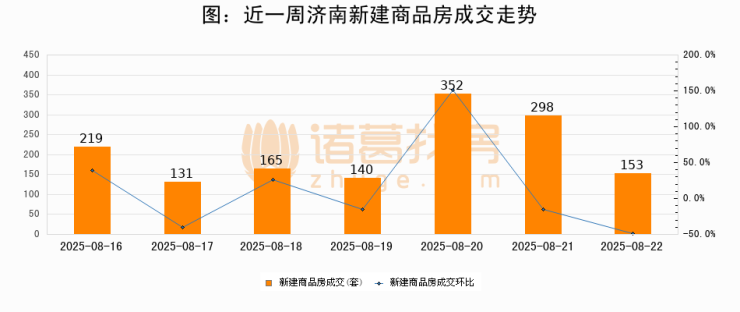 根据济南市住房和城乡建设局数据显示,2025年08月22日济南新建商品房成交153套,较昨日减少145套,环比下降48.7%。近一周济南新建商品房日均成交209套。08月22日单日成交153套,低于近一周平均水平26.8%。