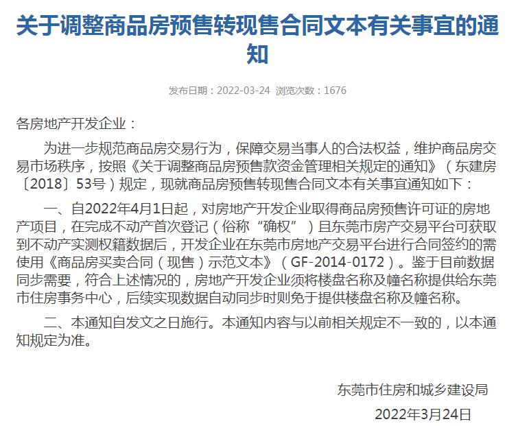 具体来看,根据该通知,自2022年4月1日起,对房地产开发企业取得商品房预售许可证的房地产项目,在完成不动产首次登记(俗称“确权”)且东莞市房产交易平台可获取到不动产实测权籍数据后,开发企业在东莞市房地产交易平台进行合同签约的需使用《商品房买卖合同(现售)示范文本》(GF-2014-0172)。
