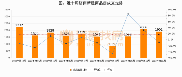 进入2023年第52周(12月18日-12月24日),济南新建商品房成交1901套,较上周减少165套,环比下降8%。从近十周成交来看,周均成交套数为1690套,本周成交1901套,高于近十周平均成交量12.5%。