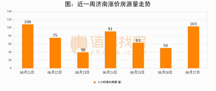 根据诸葛找房数据显示,济南24小时涨价房源量为103套,较06月26日增加53套,环比上涨106%。与此同时,涨价房源占比小幅扩大,业主信心有所提升。