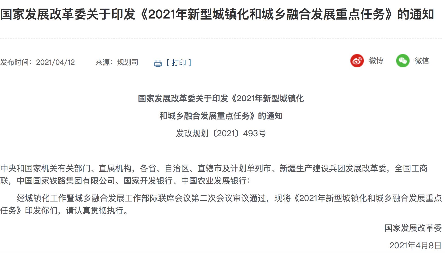 4月12日,国家发展改革委印发《2021年新型城镇化和城乡融合发展重点任务》的通知。