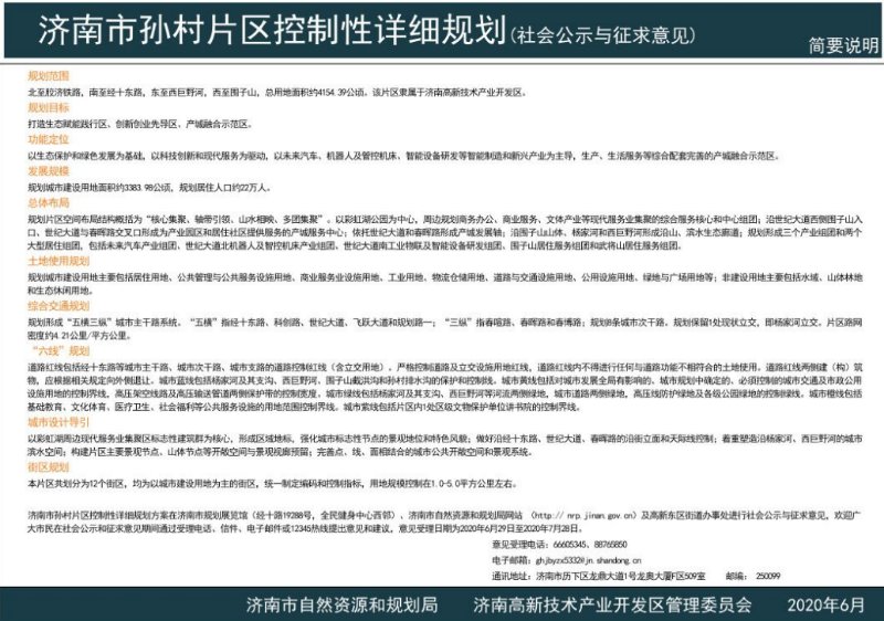 6月29日,济南市自然资源和规划局发布济南市孙村片区控制性详细规划,此次规划范围北至胶济铁路,南至经十东路,东至西巨野河,西至围子山,总用地面积约4154. 39公顷。规划城市建设用地面积约3383. 98公顷,规划居住人口约22万人。该片区隶属于济南高新技术产业开发区。