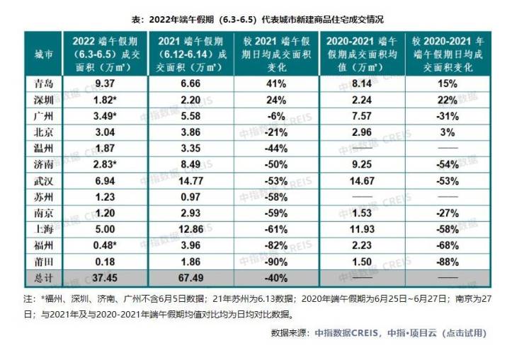6月6日,中指研究院监测数据显示,2022年端午假期期间(6月3日-6月5日),重点监测城市新建商品住宅成交面积较去年端午假期下降40%,市场仍处调整期;与去年同期(6月3日-6月5日)相比降幅超七成。部分城市如深圳、青岛、广州等城市受政策环境优化、疫情得到有效控制带动,市场活跃度略有好转,但多城新房成交规模同比降幅仍较大,武汉、济南、南京降幅均在五成以上,北京、上海受疫情影响,市场活跃度较低。