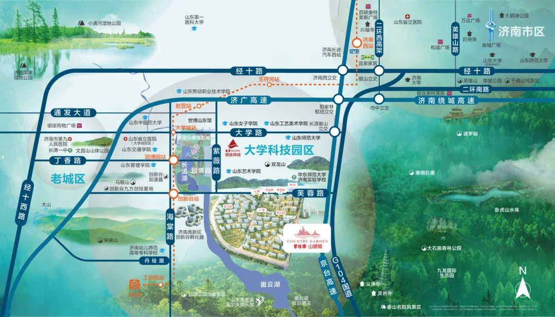 在济南长清,碧桂园依托三面环山、一面揽湖的优势区位,还打造了山湖城项目。山湖城紧邻园博园与大学城商圈,周边11所高校学府云集,文化底蕴十分浓厚;环境优美、商业完善。邻近轨交1号线,接驳2、3号线,即可通达泉城。打造这样一个真正意义上的高端、低密山湖新城,更加凸显了碧桂园对于深耕山东区域的信心。