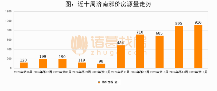 从调价房源来看,第15周济南涨价房源916套,较上周上涨2.3%。与此同时,15周涨价房源占比提升2.57个百分点,业主信心持续恢复。