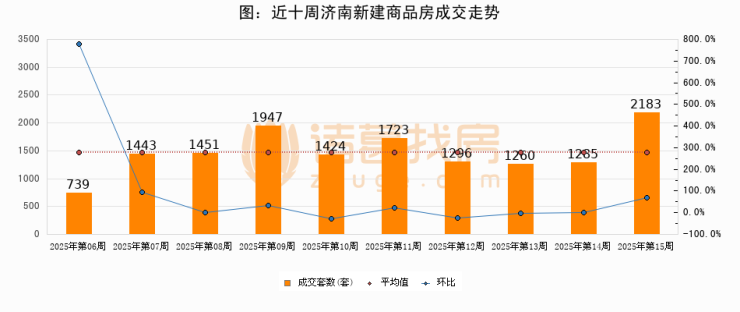进入2025年第15周(04月07日-04月13日),济南新建商品房成交2183套,较上周增加898套,环比上涨69.9%