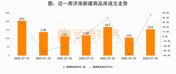 根据济南市住房和城乡建设局数据显示,2025年07月24日济南新建商品房成交154套,较昨日增加49套,环比上涨46.7%