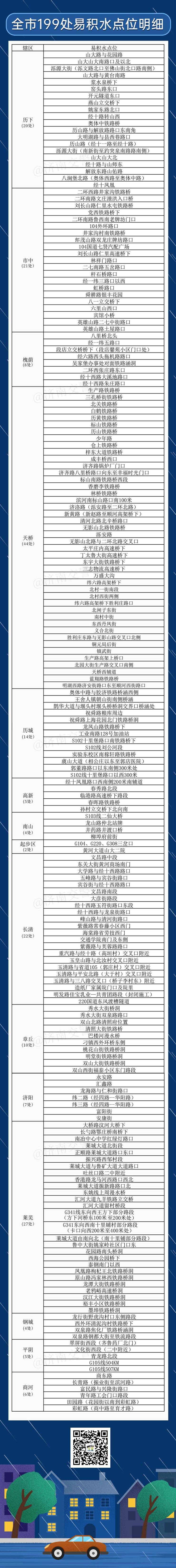 新一轮强降水要来了。山东省气象台于7月19日06时00分继续发布暴雨黄色预警。预计19日夜间到20日白天,济南全市将有中雨到大雨,局部地区将有暴雨。济南交警汇总了全市199处易积水路段,提醒广大驾驶人朋友,雨天出行切忌盲目涉水通行,遇积水路段要服从现场交警指挥,尽量选择绕行。
