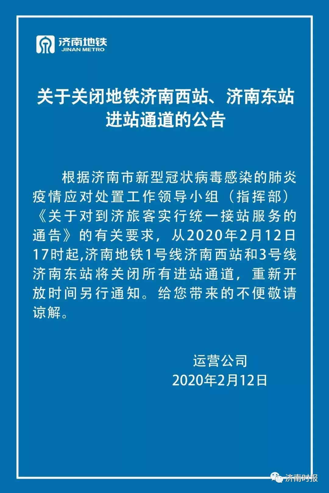 2月12日,记者从济南轨道交通集团获悉,自2月12日17时起,济南地铁1号线济南西站和3号线济南东站将关闭所有进站通道。 2月12日,济南轨道交通集团发布一条“关于关闭地铁济南西站、济南东站进站通道的公告”。公告显示,根据济南市新型冠状病毒感染的肺炎疫情应对处置工作领导小组(指挥部)《关于对到济旅客