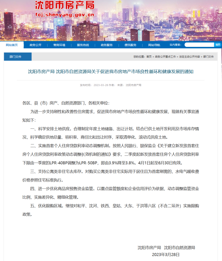 中房网讯(刘敏/文)3月28日,沈阳市房产局与沈阳市自然资源局联合印发了《关于促进我市房地产市场良性循环和健康发展的通知》(以下简称《通知》),内容涉及科学安排土地供应、调整首套房贷利率、支持公寓类非住宅去库存等。