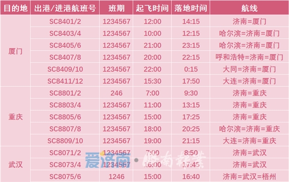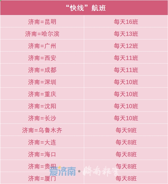 新航季,济南机场还将联合山东航空,在济南=重庆、济南=武汉、济南=厦门等“快线”航班首次推出连续数字排列的航班号及整点起飞的航班时刻,为往返旅客提供“连号”惊喜。