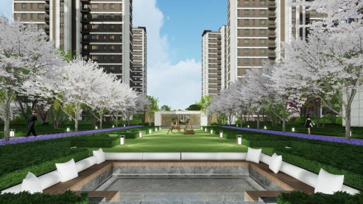 一条约百米景观中轴横贯东西,串联起麓端献瑞、泰山黑松八方迎泰、约300㎡中央水景、近500㎡大草坪等重重麓端美景,再现天下济南的雄浑和雅逸。